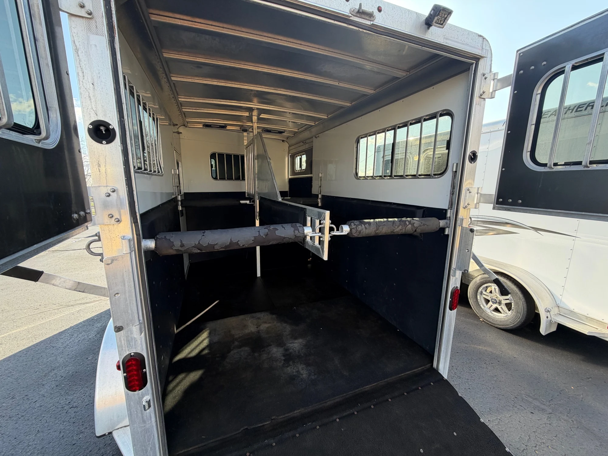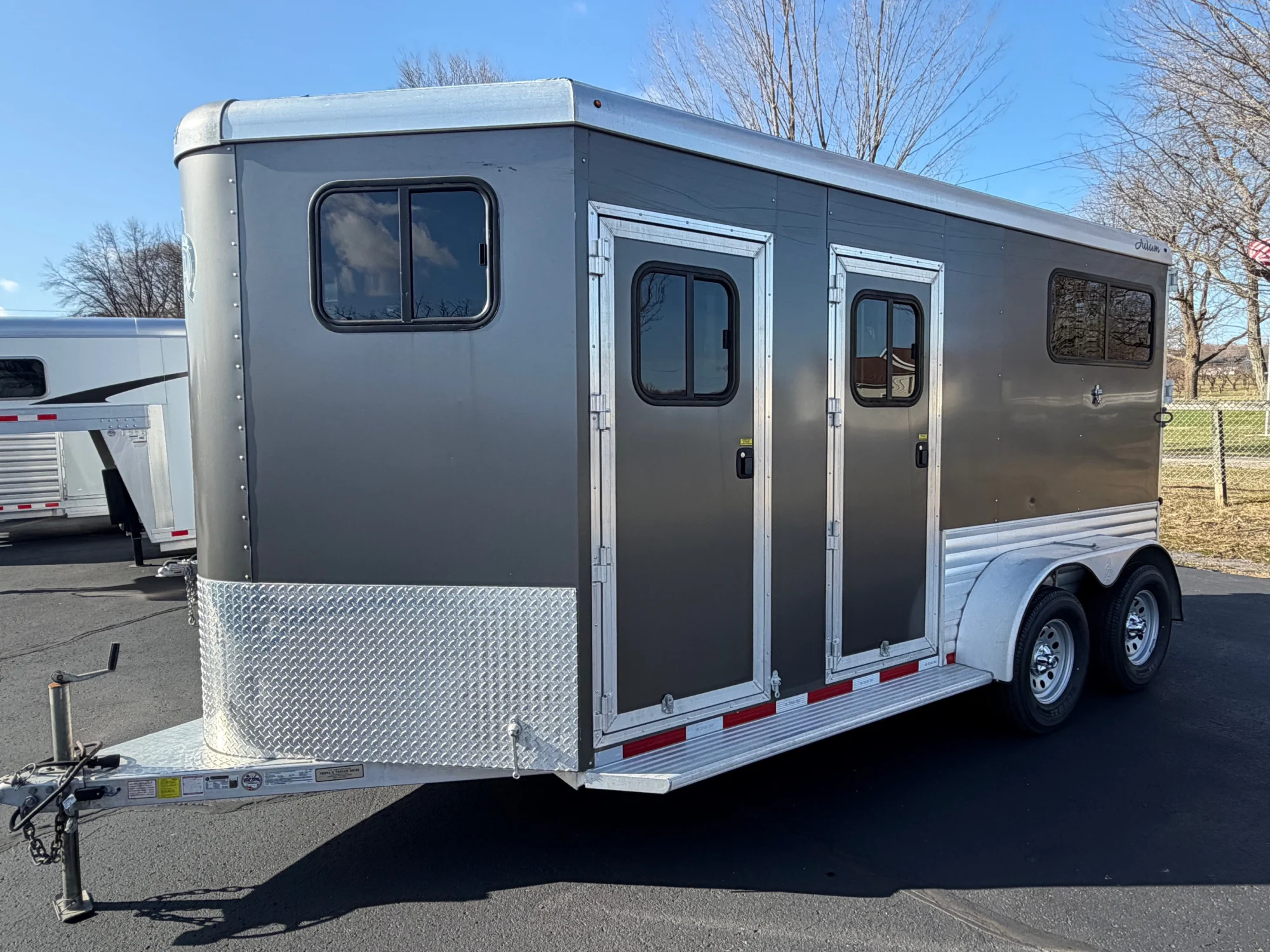 2023 Adam’s 2 Horse Bumper Pull w Side Ramp. 15’ 6” long, 6’ 8” wide, 7’ 6” tall. NEW TIRES, Large front dressing room has two saddle racks, Windows in the nose and the bulkhead window between the horse area and the dress room. There is a spare tire in the dressing room. The horse area has a side ramp with an access door across from the side ramp, Removable divider with removable chest and butt bars. Fully rubber lined fully padded. Rear ramp with Dutch doors above. We have gone through the bearings and the brakes on this trailer, everything looks great and is ready to roll. The trailer is in good condition. It has some minor scratches in the skin.
