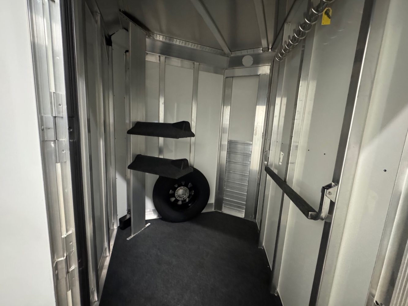 ID #42724. 2025 4-Star two horse bumper pull with side ramp and dressing room. 16’ box, 6’ 10” wide and 7’ 6” tall. Larger warmblood stalls in the horse area with quiet ride divider, chest bars, and butt bars. There is a side ramp on curbside that is EZ Lift with a walkout door across from it. EZ lift Rear ramp with doors above. The dressing room has two saddle racks, 10 bridal hooks, one blanket bar, one brush tray and a spare tire. This trailer is like brand new.