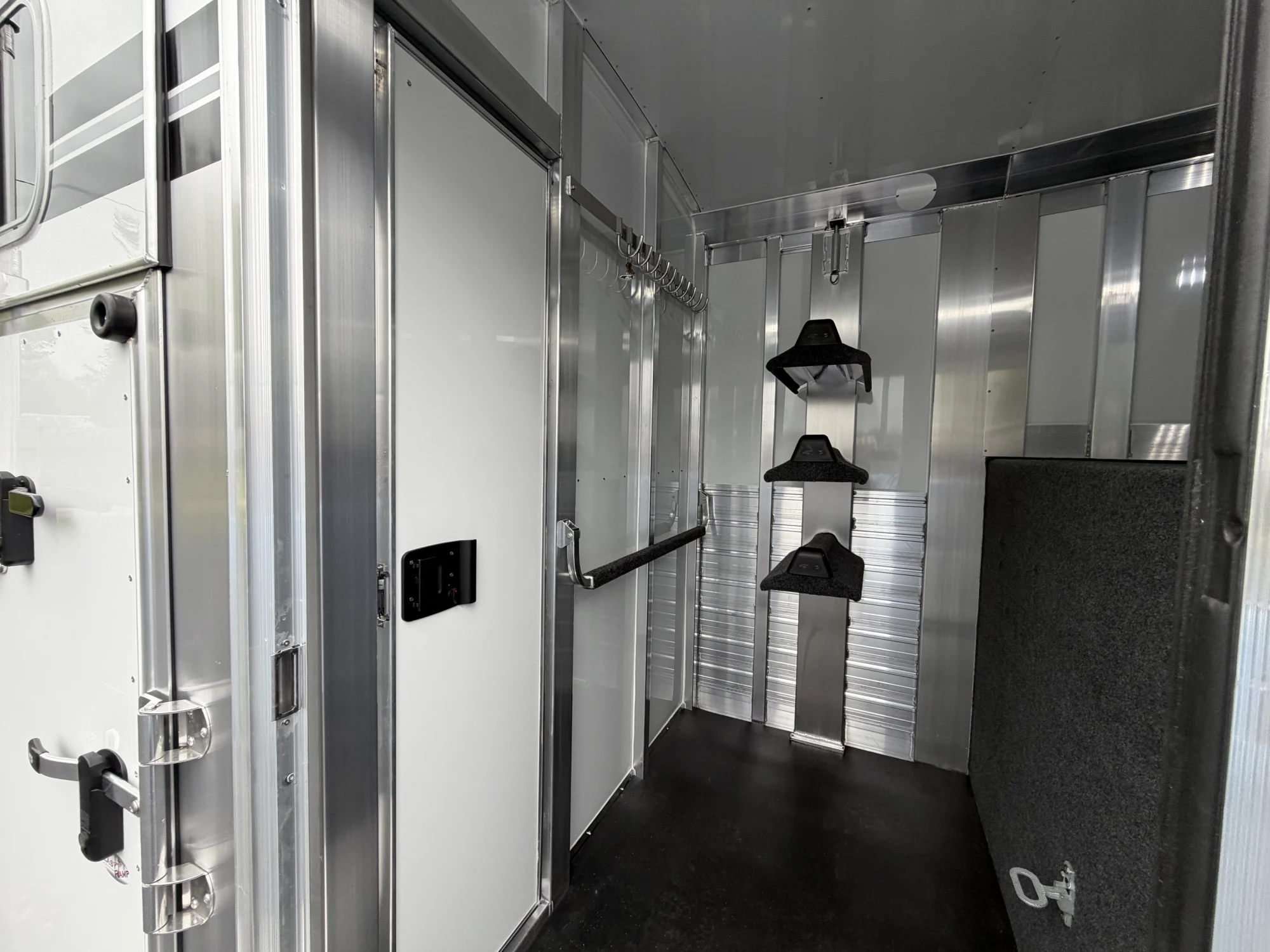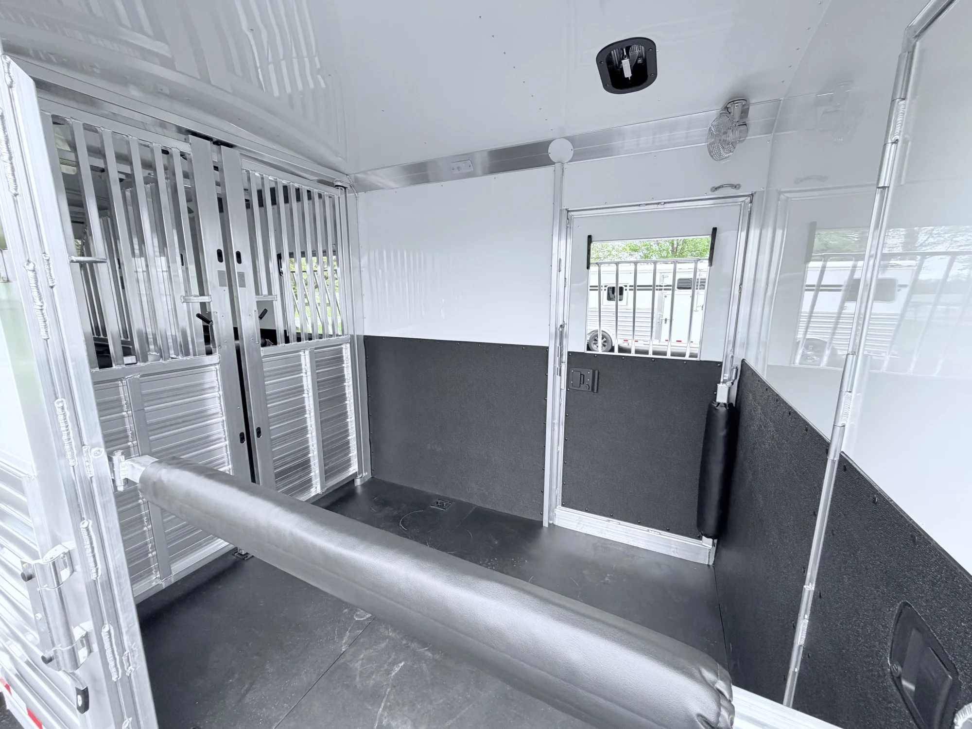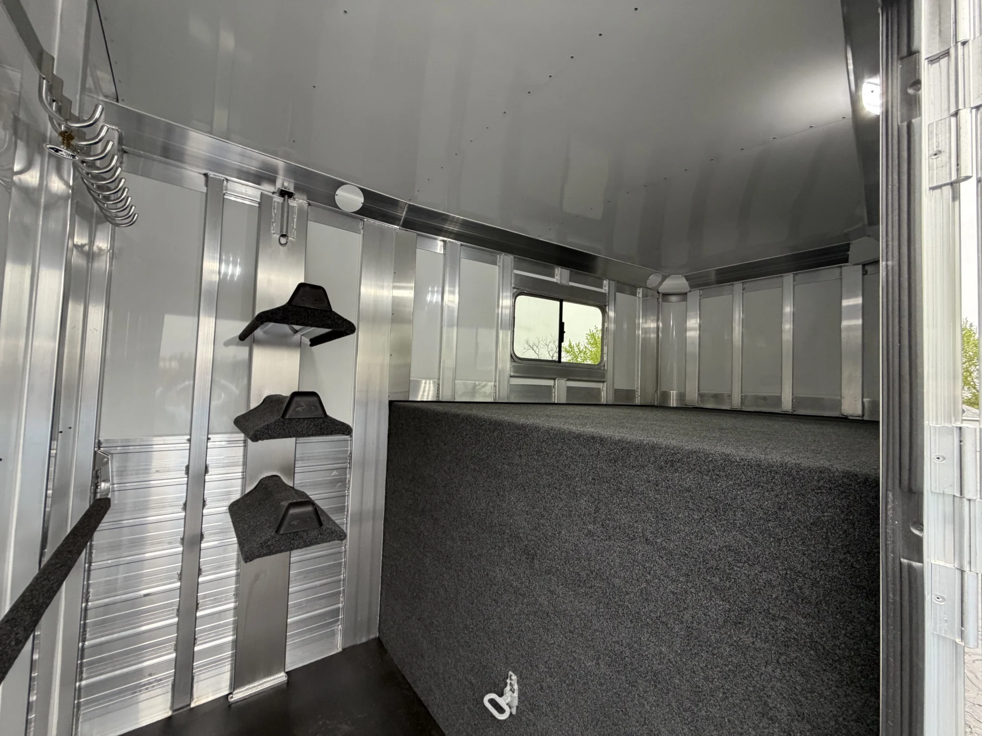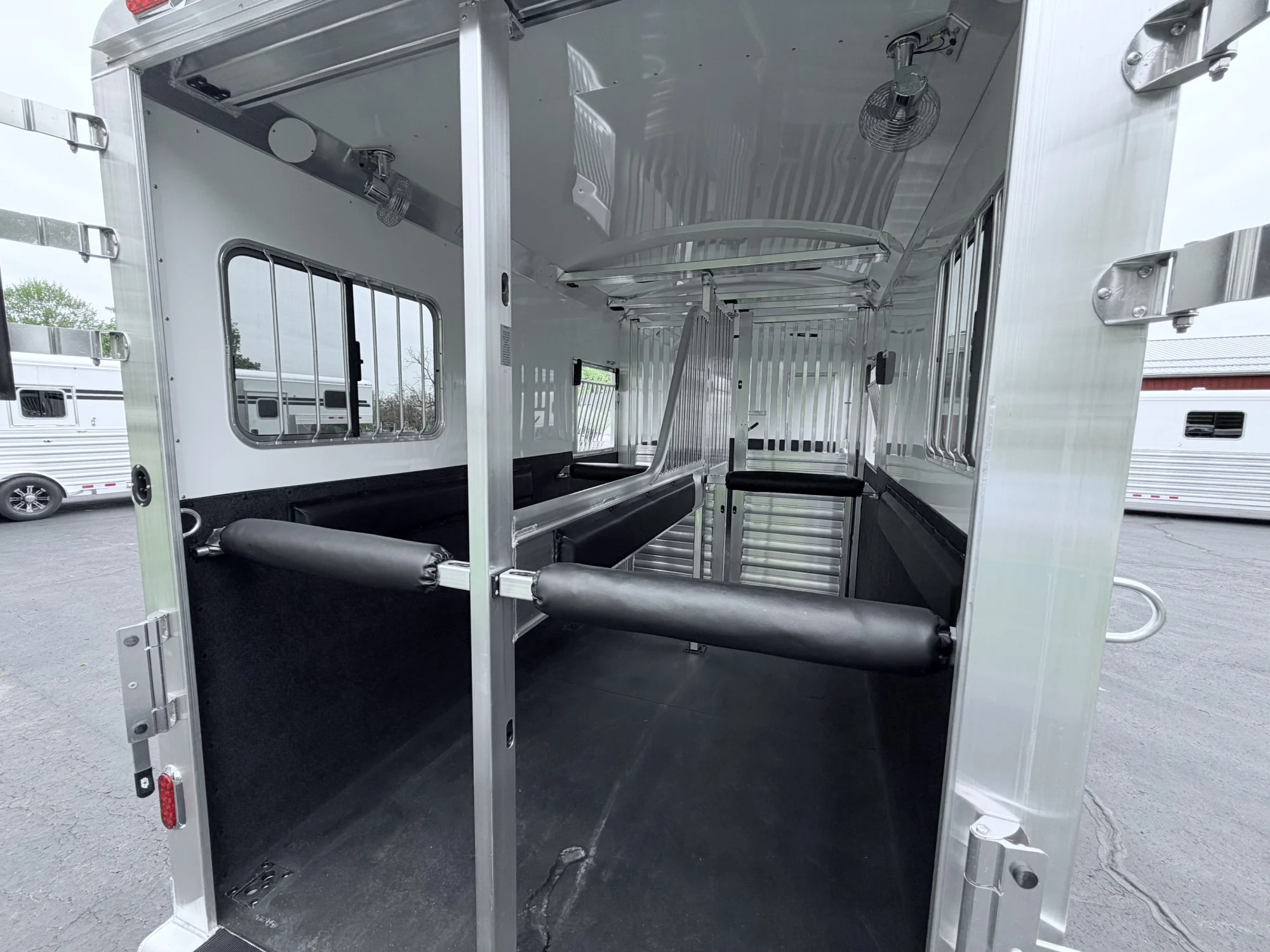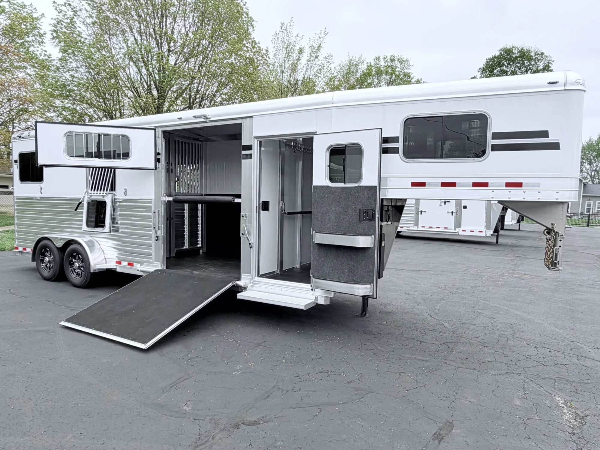 102" Box Stall, 2 Box Stalls, 8' Tall, Aluminum Body, Aluminum Frame, Aluminum Slats, Dressing Room, Easy Lift Ramps, Easy Lift Side Ramp, Escape Door, Exterior LED Lights, Hydraulic Jack, Insulated Roof, Larger Side Windows, Quiet Ride Dividers, Saddle Racks, Side Load, Stud doors