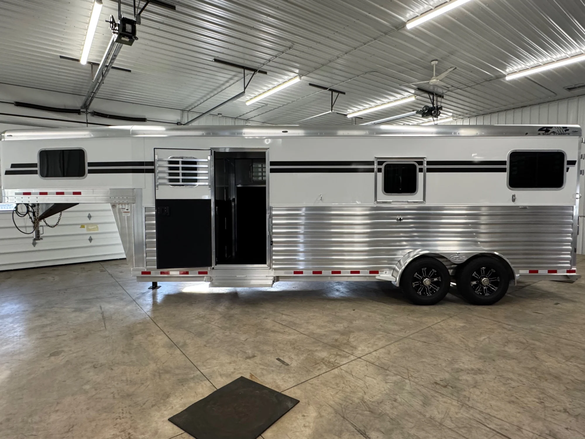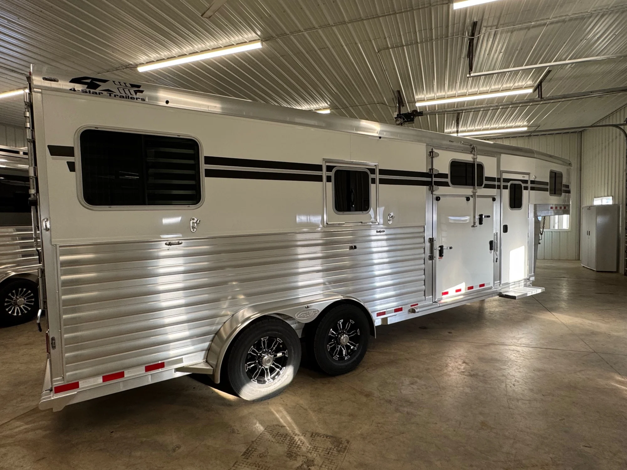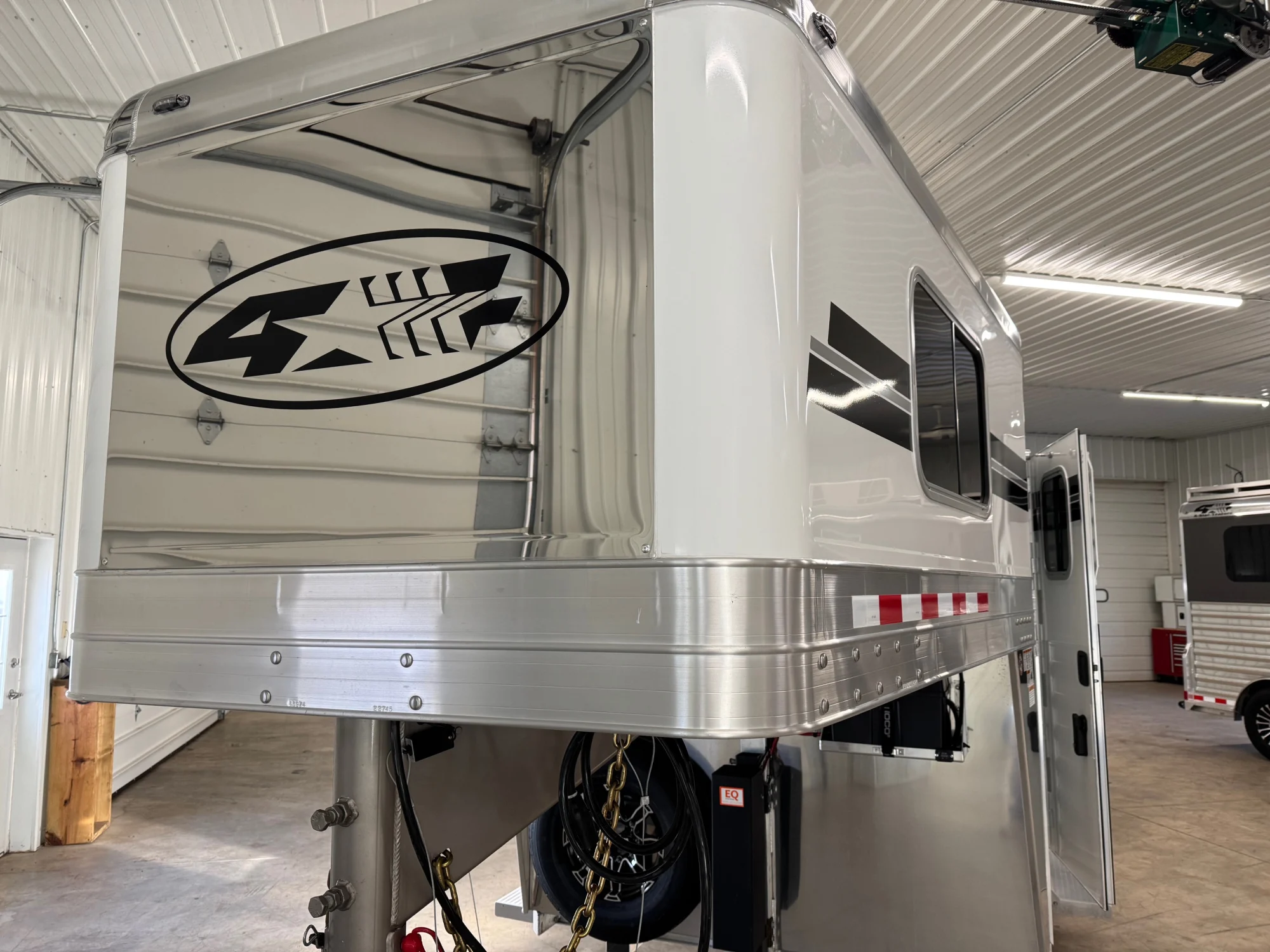 2027 4-Star 2+1 Gooseneck w Warmblood Size Stalls. 23’ 6” box, 8’ Tall 6’ 10” wide. Larger warmblood stalls, Larger head area, larger 102” box stall, 4’ front dressing room. 8000 LB hydraulic Jack, longer gooseneck which gives you more clearance for your tailgate when backing up to the trailer. White skin with graphics & stainless steel on the nose. The dressing area has three removable saddle racks, 10 bridle hooks, a brush tray and a blanket bar. There is a door from the dressing room to the horse area. The roof in the dress area is insulated which eliminates condensation on your tack. Rubber on the dress area floor. The horse area is fully double walled and insulated, the roof on the entire trailer is insulated including in the dressing room, heavy duty bars over all of the windows, drop down doors with drop down bars at each horse’s head, quiet ride divider, chest bars, butt bars, and a quiet ride stowaway bar over the ramp. This horse trailer has the new Quiet ride stud doors, along with 4-Star’s new rolling quiet ride divider that can lock against the wall to create a box stall easily. This trailer has 3 fans in the horse area, extra interior lights, extra exterior load lights, extra roof vents in the box stall, 1 fold down step at the dress area door and 1 fold down step at the walkout door. The walkout door across from the ramp also has a slam latch in it for easy access. Both the side and rear ramp are taller ramps to create less of a loading angle. This horse trailer is loaded! If you would like to add WERM Flooring to this unit, it is $2,800.