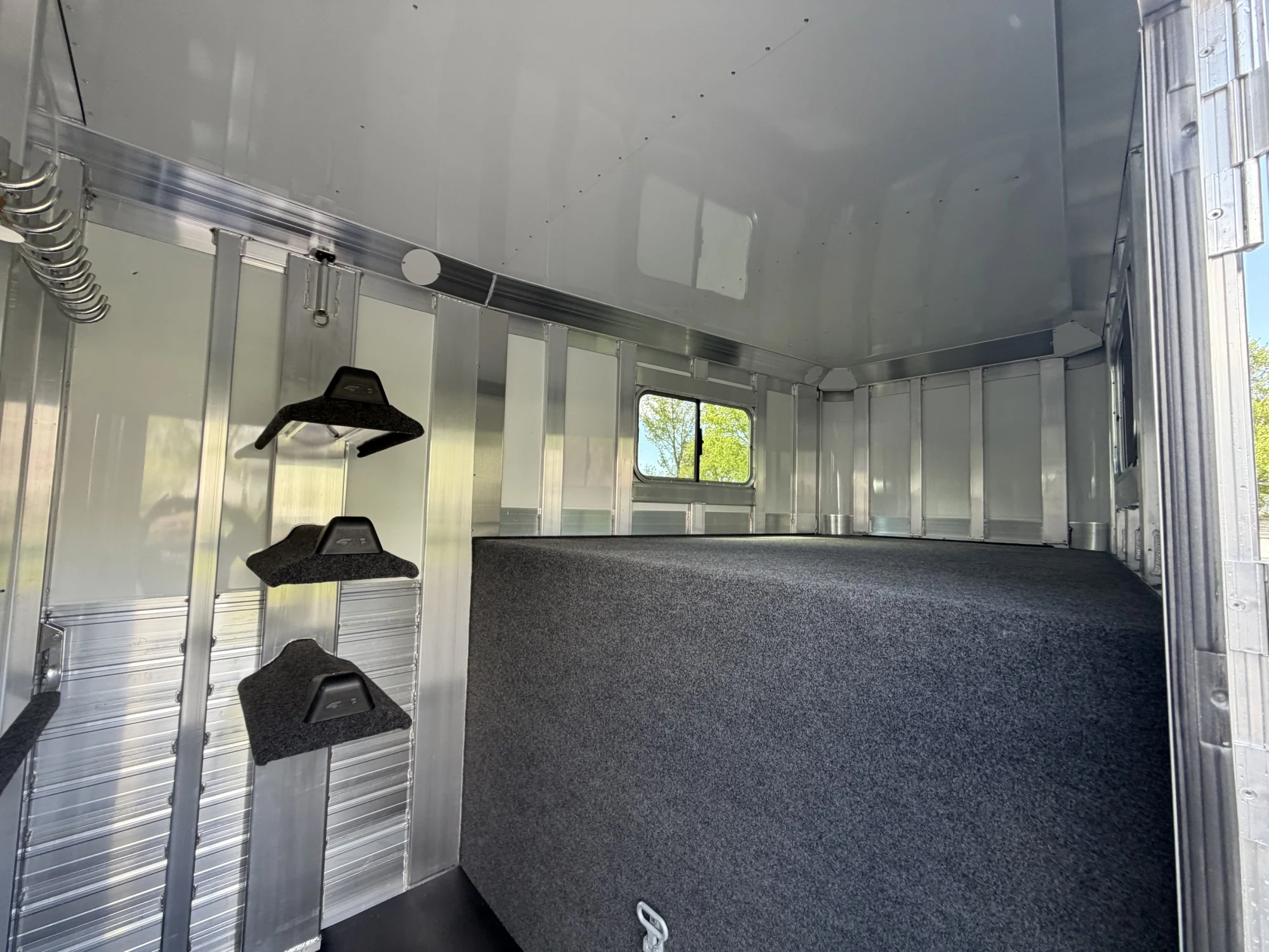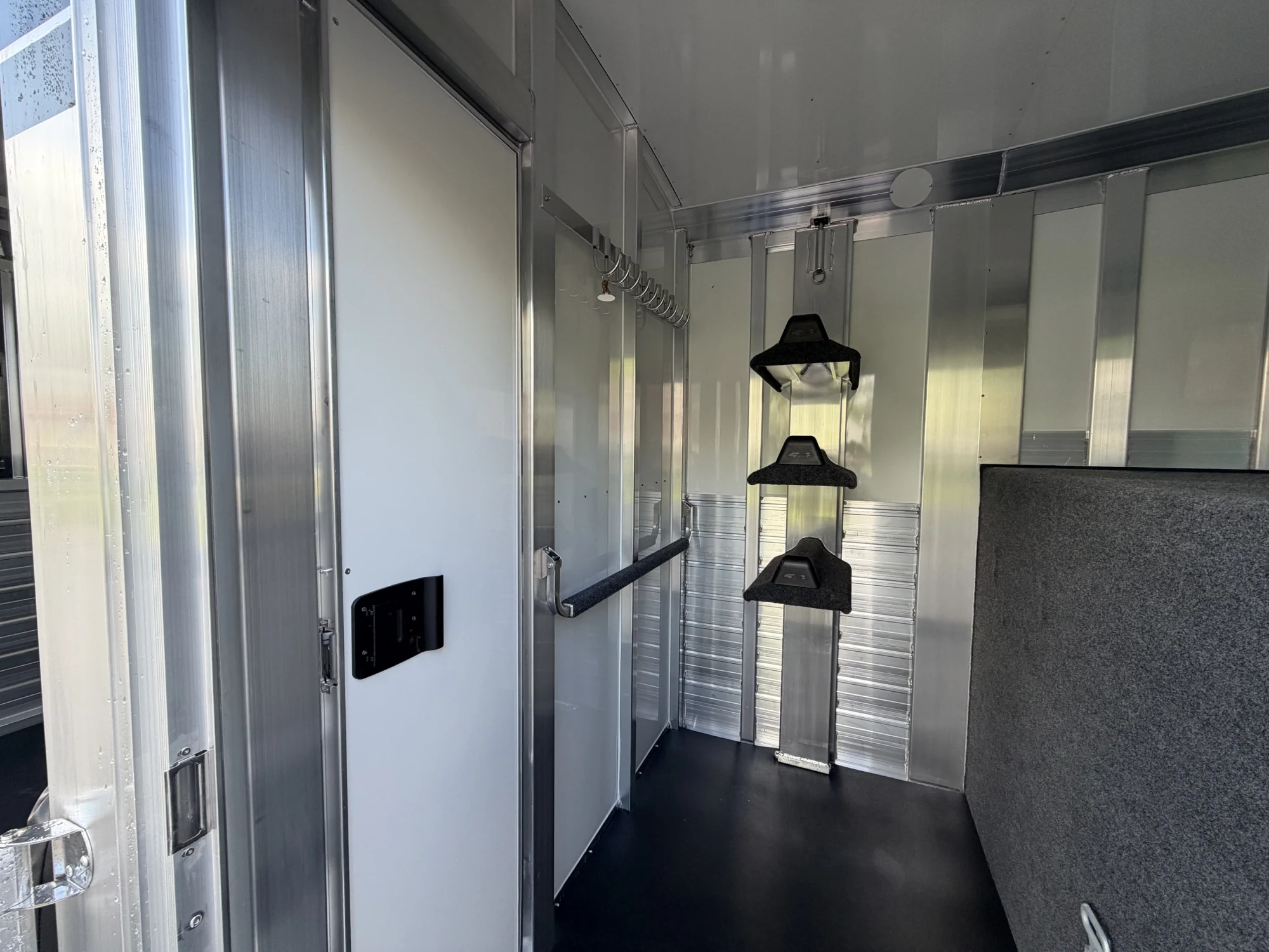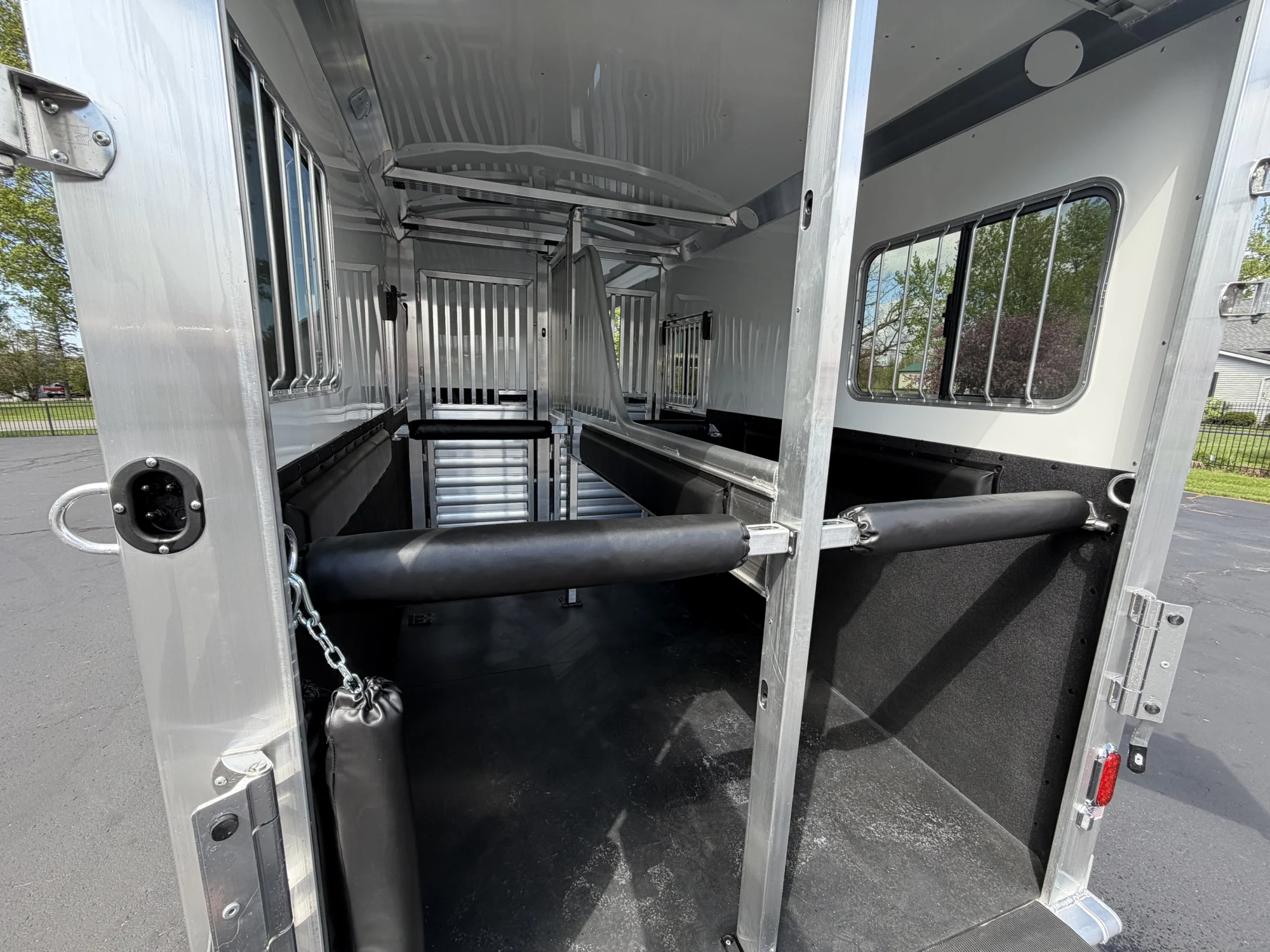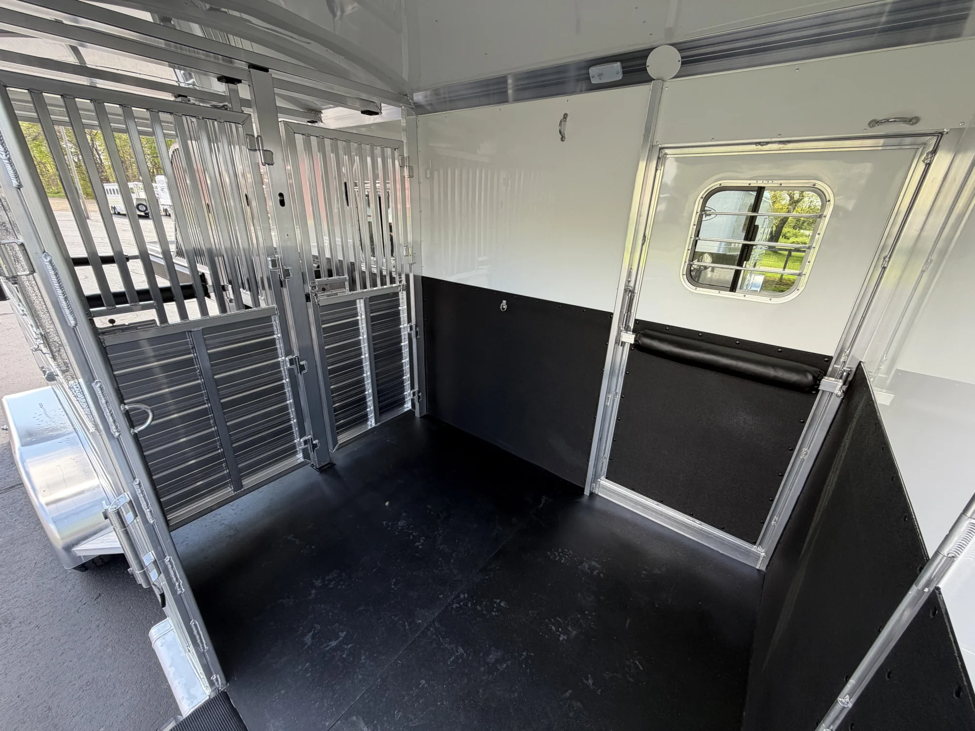 102" Box Stall, 2 Box Stalls, 8' Tall, Aluminum Body, Aluminum Frame, Aluminum Slats, Dressing Room, Easy Lift Ramps, Easy Lift Side Ramp, Escape Door, Exterior LED Lights, Hydraulic Jack, Insulated Roof, Quiet Ride Dividers, Saddle Racks, Side Load, Stud doors